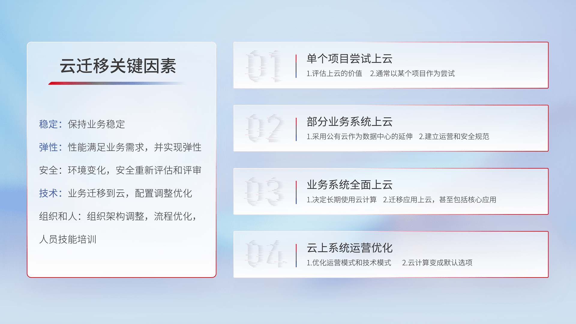 结合实际业务,,,从规划设计、、、云平台选型、、云原生改造、、数据迁移、、、集成交付,,,,迁移全过程为客户识别最佳上云路径,,做好风险识别管理,,,设计网络架构、、身份权限、、、安全审计合规、、、操作审计、、、日志审计、、监控告警策略、、、、多站点容灾设计等,,对云上基础设施进行整体规划,,,,提升IT治理水平,,,,以满足弹性、、高可用、、、高性能的需求。。。