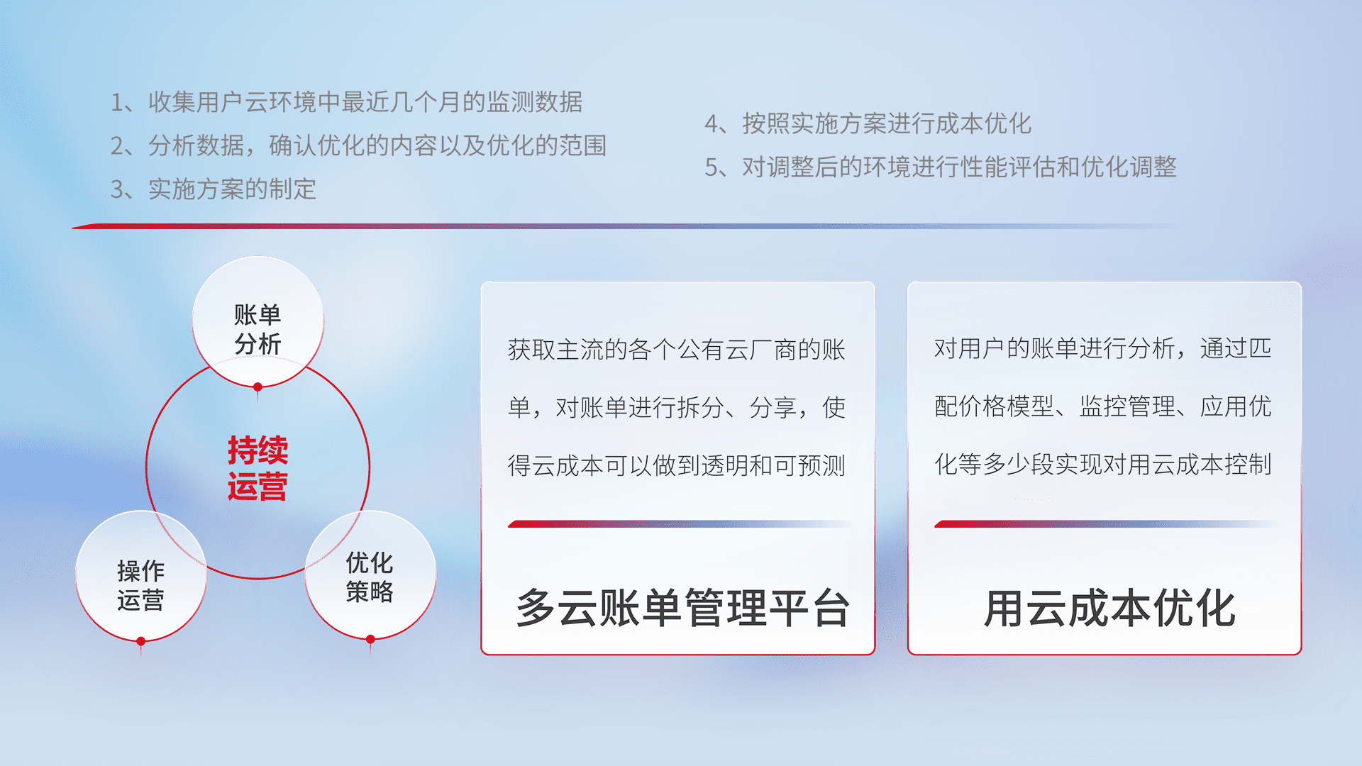 通过灵活运用多种自动化迁移工具,,,,帮助企业用户实现业务和数据高效 、、、、稳定的上云迁移和云上迁移,,,,采用自研多云纳管平台,,,以中立管理模式,,,解决多组织、、多云、、多运维厂商的复杂关系的管理,,保证多云平台资源配置的一致性,,,,实时掌控云资源运行数据,,运用智能化工具分析云资源多云平台的管理服务,,透明化管理成本支出,,,,用云成本可预测、、、用云费用可优化、、、、云资源配额有据可依。。。。