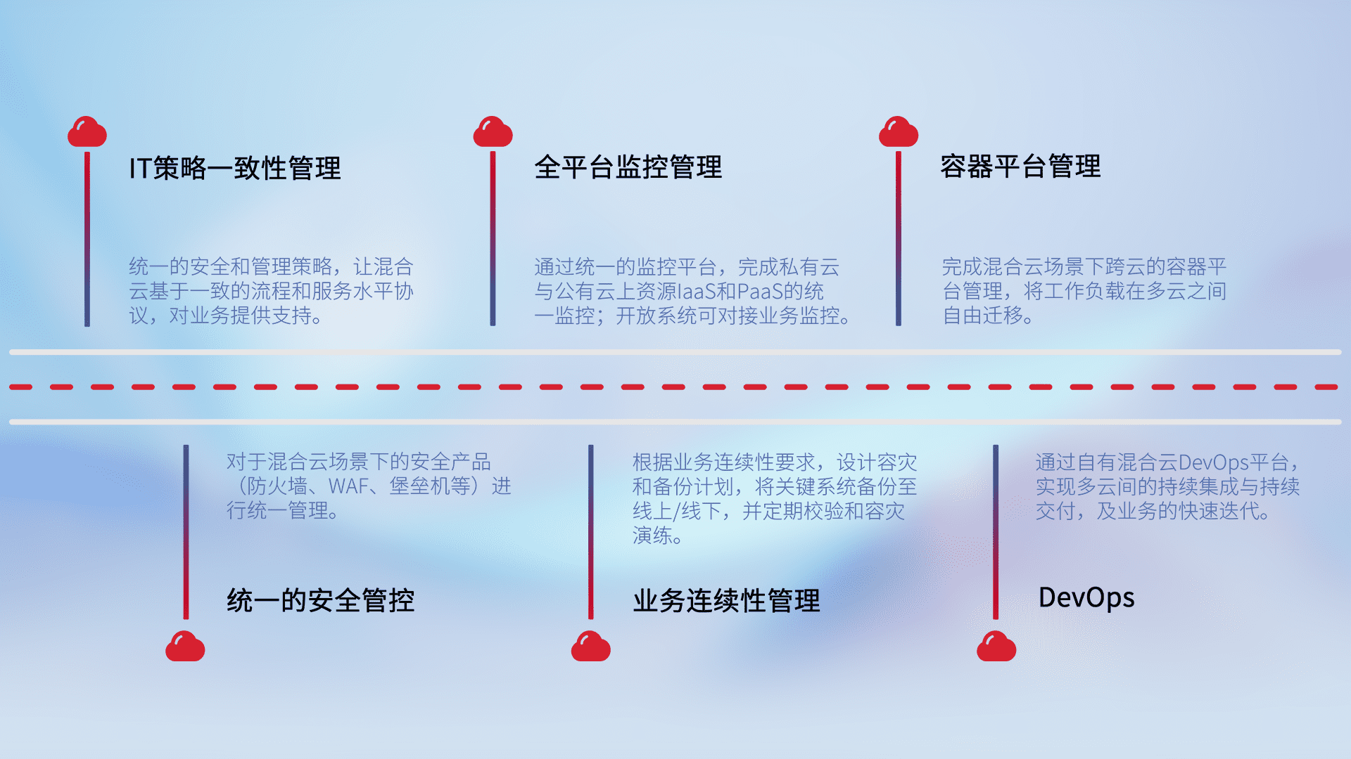 通过多云纳管,,,以统一的资源数据模型把客户的云资源进行抽象和封装,,,进而实现对多云资源的统一操作,,保障云资源管理的可靠性、、稳定性与可用性。。。。量身定制化运维内容,,配置、、、、开发运维、、、补丁管理、、、备份、、、监控、、认证和访问管理、、审计和日常巡检等,,保障在用云过程中的可靠度,,稳定度以及高可用率。。。